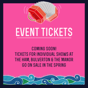 Discounts will be available to residents who to live within the EX10 postcode area for Pre-Festivals, Ham Lunchtime and Afternoon concerts, Ham Evening concerts, Bulverton evening and Bulverton Late Night Extra events. These are available in person, in advance from Sidmouth Tourist Information Centre (TIC) and the online Box Office, with identifying documents.  Not available on the door.